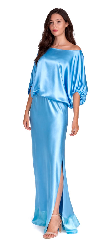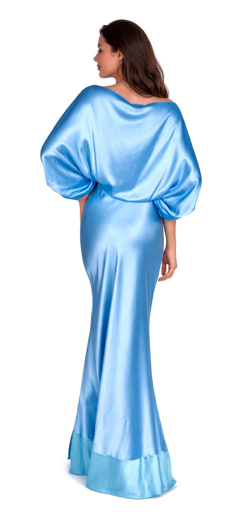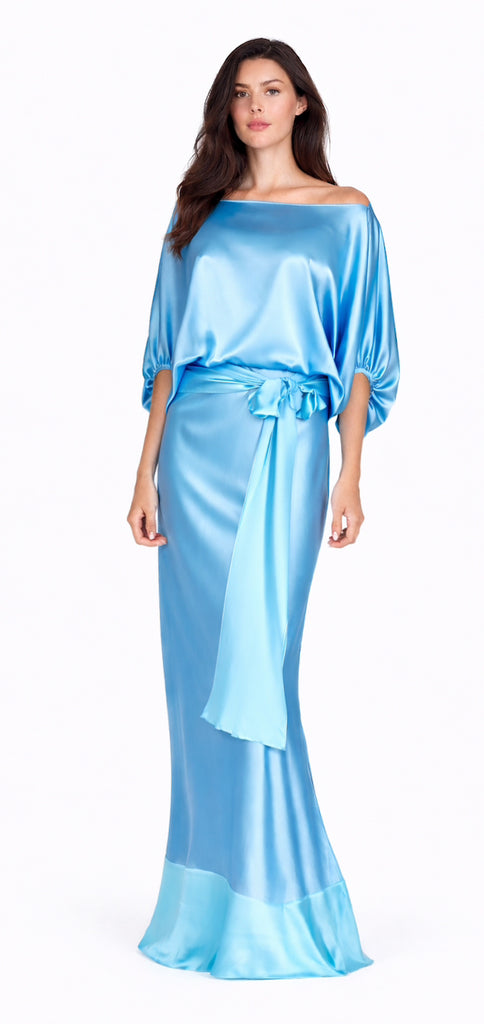 Dive into elegance with the Ocean 58 dress, a masterpiece crafted from the finest luxury Italian silk. Featuring a harmonious blend of two mesmerizing blue tones inspired by the ocean and sky, this dress is a celebration of natural beauty. Its fluid silhouette flatters the figure, while the included sash offers versatile styling options.