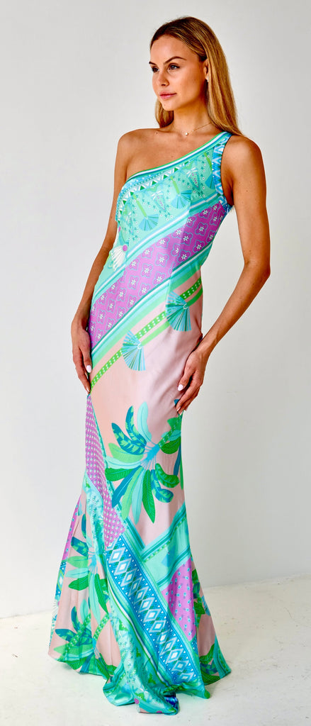 The bold print — a vibrant fusion of colors that evokes the mood of endless summer afternoons, where cocktails flow and conversations linger. Its asymmetric neckline adds a modern edge, while the cut ensures a flattering, feminine drape that elongates the form.