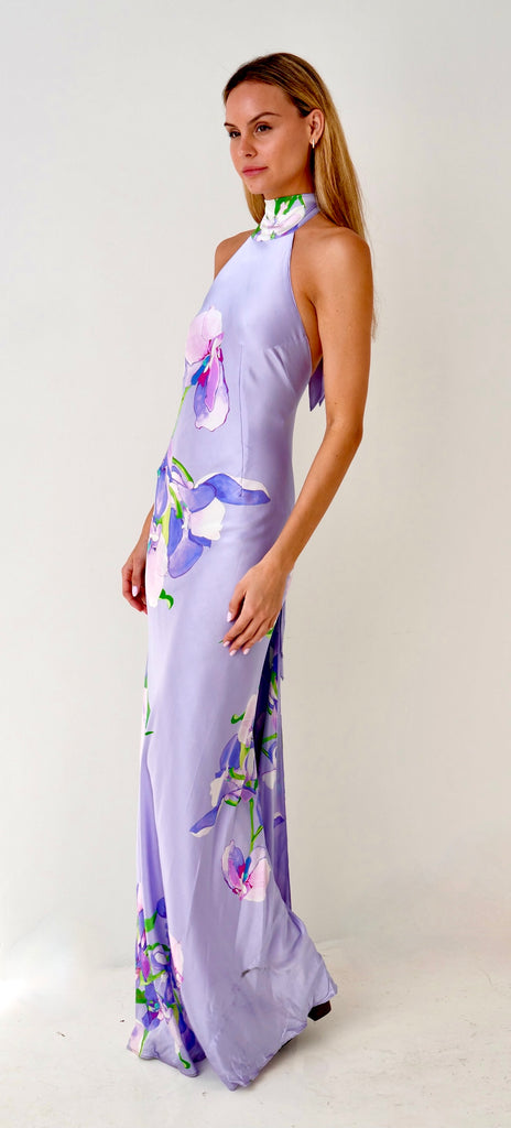 Lavande is a refined halter-neck silk maxi dress designed with an elegant, uninterrupted line. The high neckline frames the shoulders and collarbone, creating a clean, elongated silhouette that falls smoothly through the body to a fluid full-length hem.