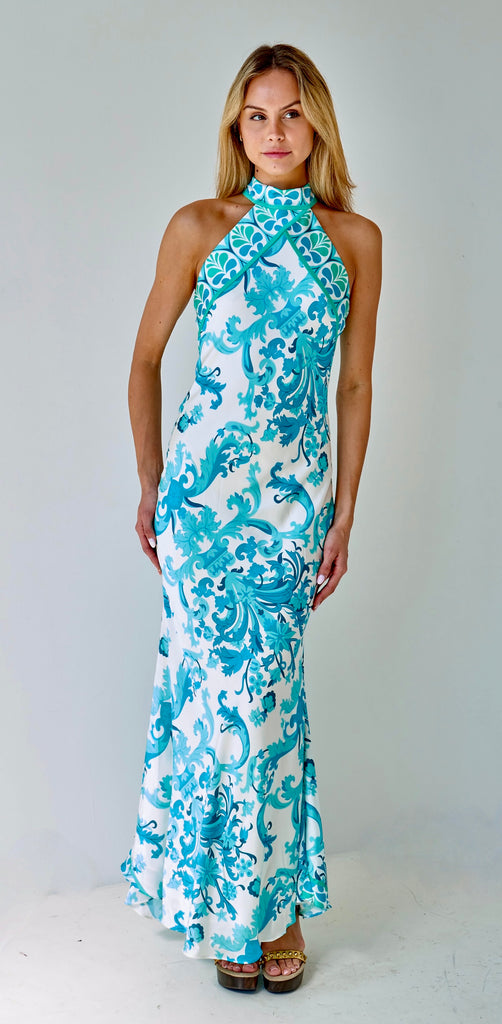 The back reveals an elegant open keyhole detail, secured at the neck, creating a striking contrast to the refined front while maintaining a confident, balanced silhouette. The print features swirling baroque-inspired motifs in layered shades of turquoise and seafoam set against a crisp white ground, giving the dress freshness, depth, and visual energy.