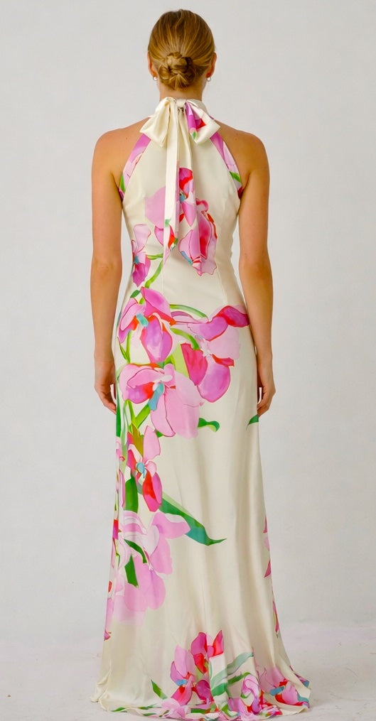 The Paloma Dress is cut from fluid Italian silk in a soft butter hue, brought to life with oversized pink florals that feel fresh, feminine, and quietly striking. Designed with a clean halter neckline and a streamlined silhouette, it skims the body beautifully before falling to a full-length hem.