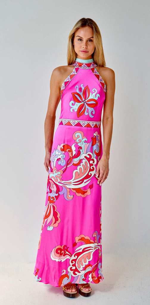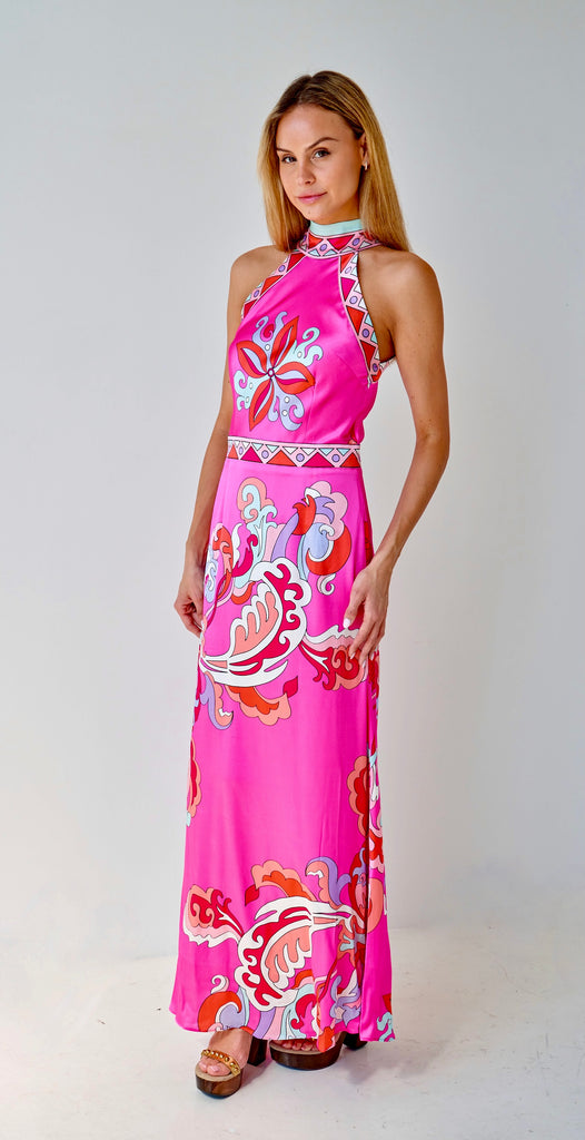 Pink Rococo is a striking halter-neck maxi dress crafted in luminous silk, designed to make colour the focal point. The silhouette is clean and elongated, with a high neckline that frames the shoulders and creates a refined, confident line through the bodice.