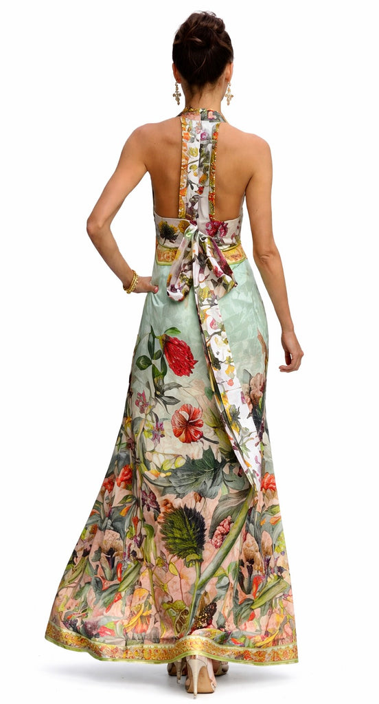 Always a tribute to love and beauty, our Poeme dress captures the essence of romance and elegance. Poeme 12 features a long silhouette crafted from luxurious Italian stretch silk, adorned with a captivating array of floral motifs in vibrant hues.