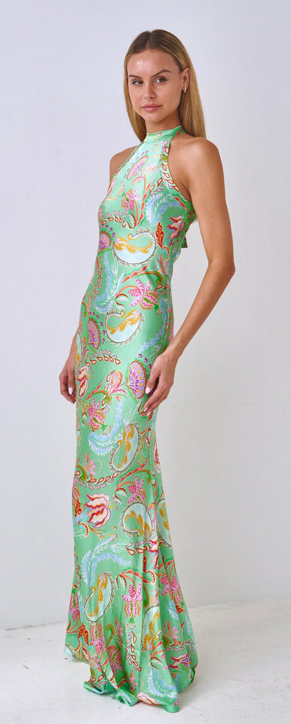 Set against a soft seafoam green ground, the print features swirling botanical and paisley-inspired motifs in shades of pink, coral, ivory, and soft gold. The pattern is lively yet balanced, offering visual interest while remaining refined and easy to wear.