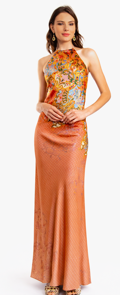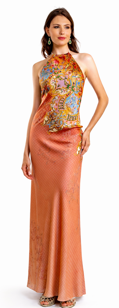 The dress speaks to the timelessness of sophistication and grace. Its muted colors add a subtle hint of glamour, while its intricate detailing brings a unique charm that can't be ignored. This is one dress that will take you through any occasion, from a casual evening dining al fresco with sandals and a denim jacket to an elegant night out with heels and a pashmina. The luxury Italian silk stretch material is adjustable to flatter any figure, and the ties in the back can easily be customized for a personalized fit.